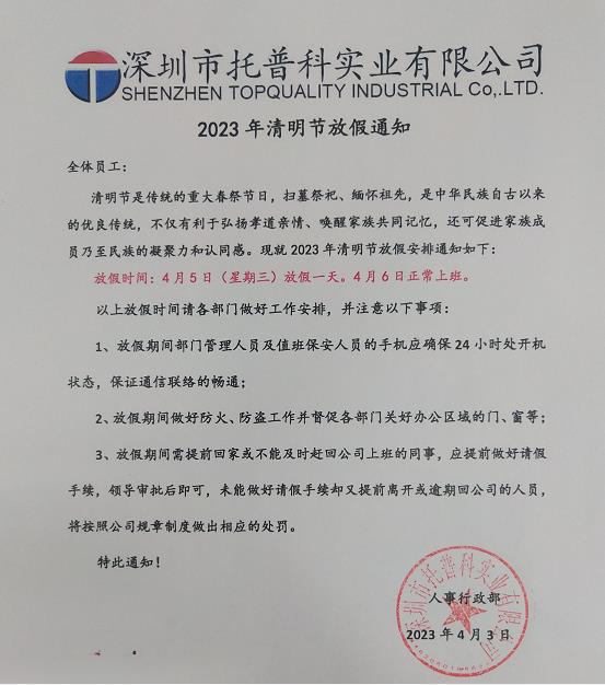 清明節即將來臨,根據公司實際情況,結合國務院關于清明節放假安排